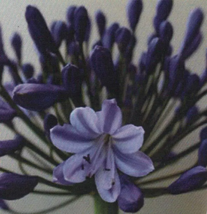 Agapanthus 'Johanna' heeft brede riemvormige bladeren en bloeit rijkelijk op stevige stelen met ronde schermen van trompetvormige blauwe bloemen met een donkerblauw streep.