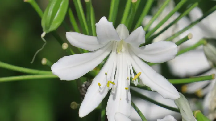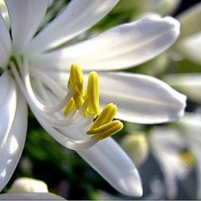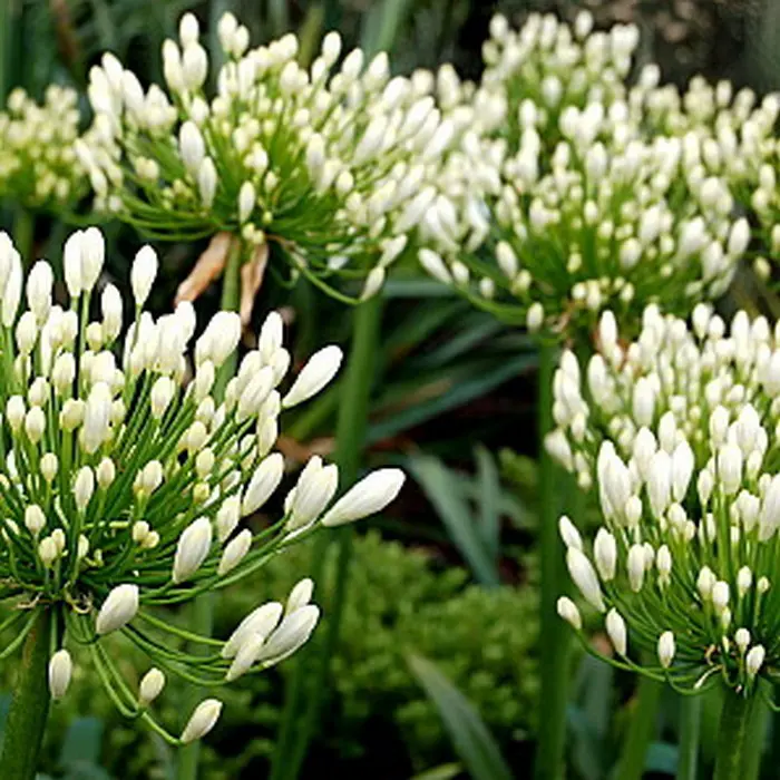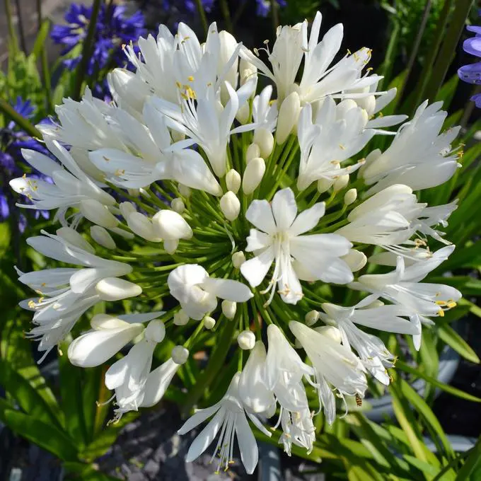 Agapanthus 'White Heaven' (funnelgroep) heeft riemvormige bladeren en bloeit met grote dichte schermen van witte trompetvormige bloemen op stevige stengels.