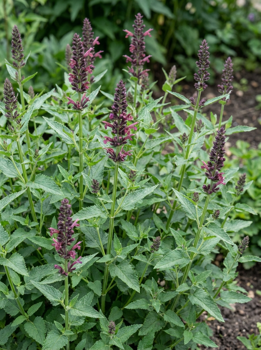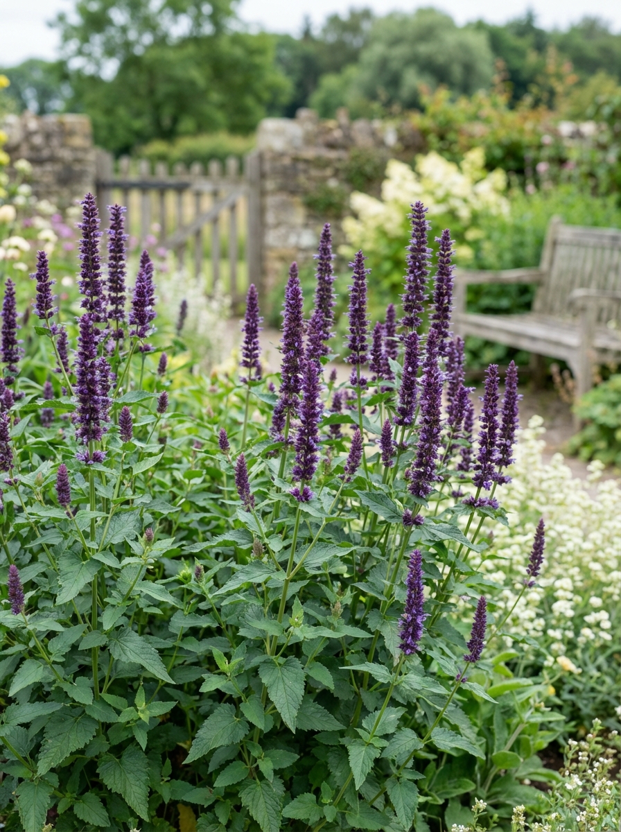 Bloeit met donkere aren van blauwpaarse bloemen, is iets donkerder dan Agastache 'Blue Fortune'
