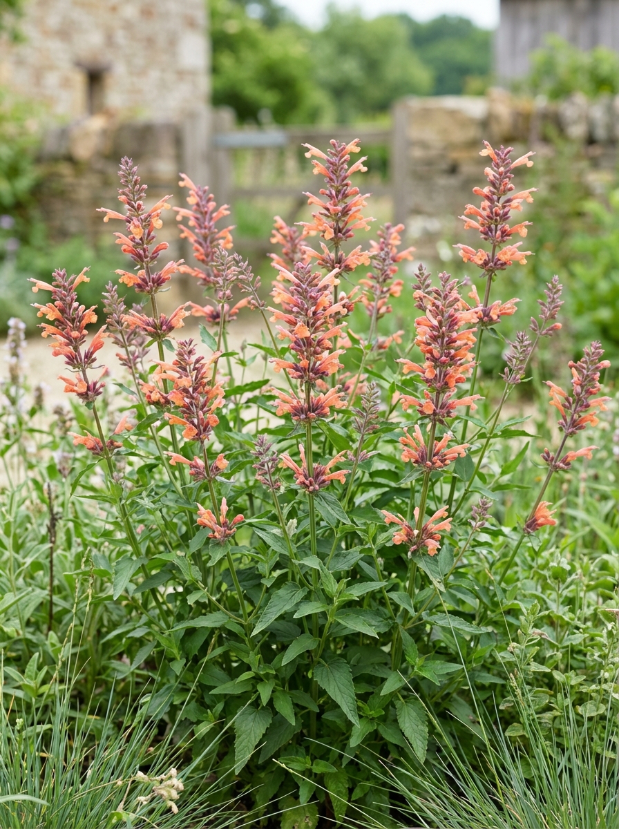 Agastache 'Kolibri' vormt een compact en rechtopstaand bosje, dat de hele zomer onvermoeibaar bloeit met mooie zacht abrikoos tot zalmoranje bloemaren.