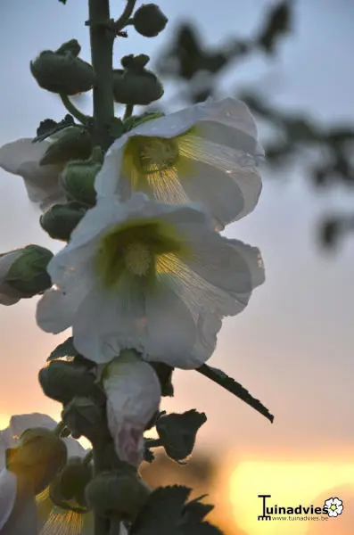 Alcea Rosea 'Alba' best planten op een standplaats uit de wind, anders is aanbinden aangewezen.