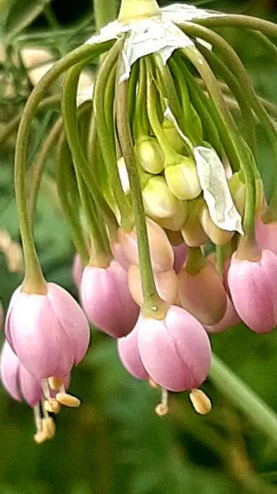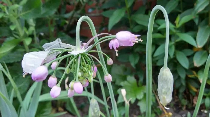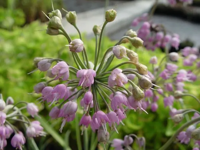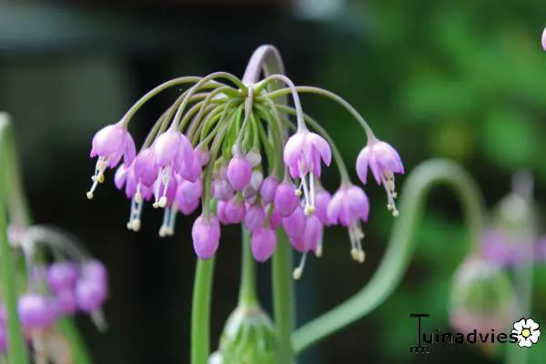 Allium cernuum bloeit aan stevige stelen met hangende bloemschermen van purperroze klokvormige bloemen.