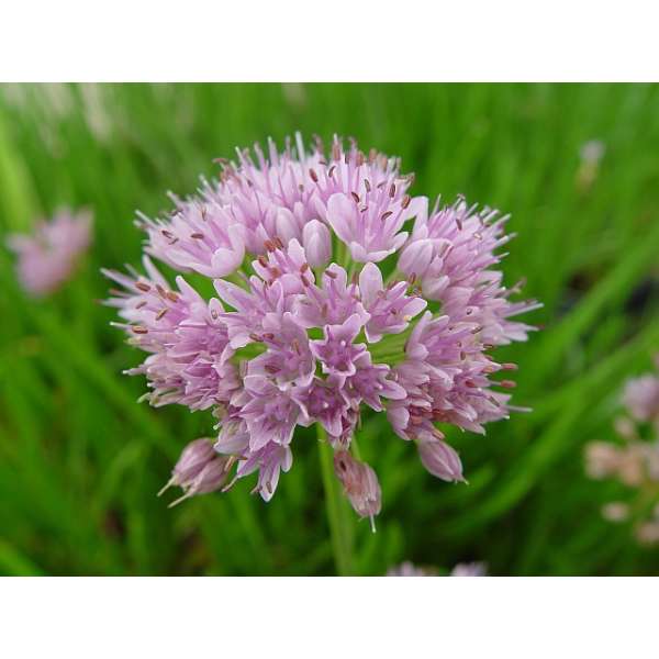 Allium senescens vormt een pol van grasachtige blauwgroene bladeren en een groot aantal snoeproze bolvormige bloemen.