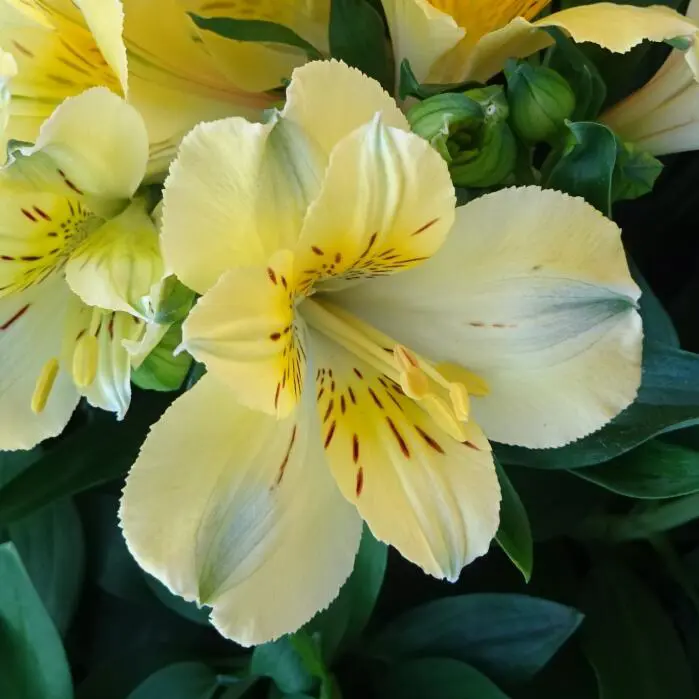 Alstroemeria 'Havana' bloeit met lelieachtige felgele bloemen met fijne kastanjebruine streepjes in de keel.