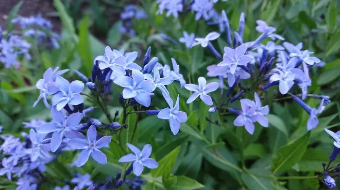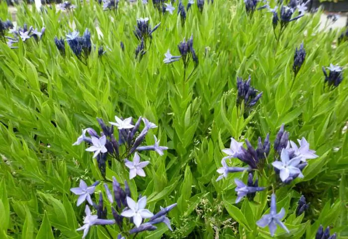 Amsonia 'Blue Ice' een hybride en onderscheidt zich door een langere bloeiperiode met pluimen van kleine sterachtige bloemen met een heel donkere bloembuis en waarvan het lichtblauw intenser en dieper is dan bij elke andere Amsonia.