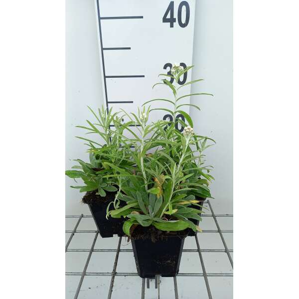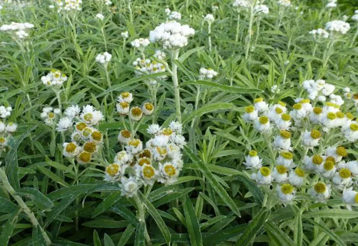 Anaphalis margaritacea 'Neuschnee' vormt witte stengels met lange smalle, behaarde grijsgroene bladeren met een witte onderkant.
