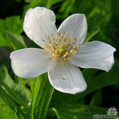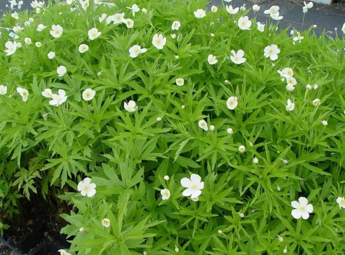 Anemone canadensis is een stevige plant met sierlijk, mooi gesneden blad en een helderwitte bloemen met een groenachtig hart en gele meeldraden.