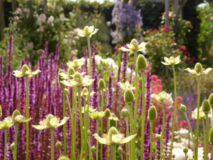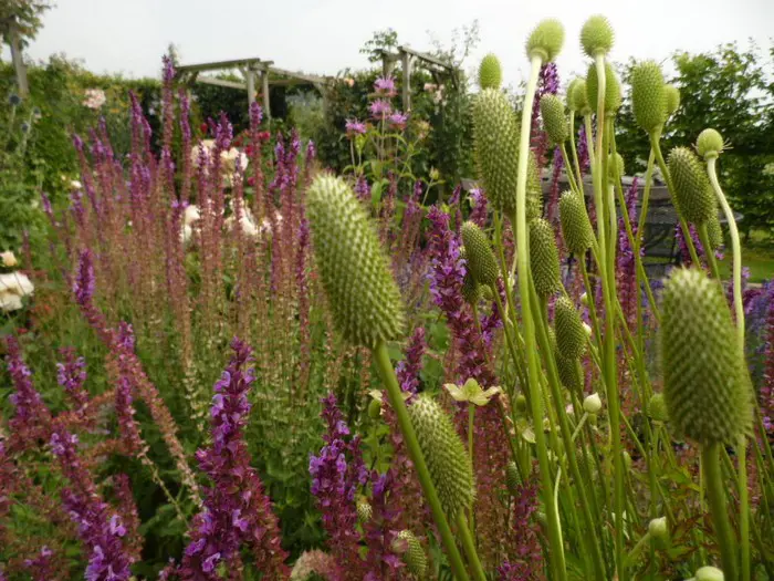Bloeit in de zomer met groenachtige witte bloemen op hoge stevige stengels, gevolgd door lange decoratieve kaarsvormige aren (3cm.) die tot de winter blijven bestaan.