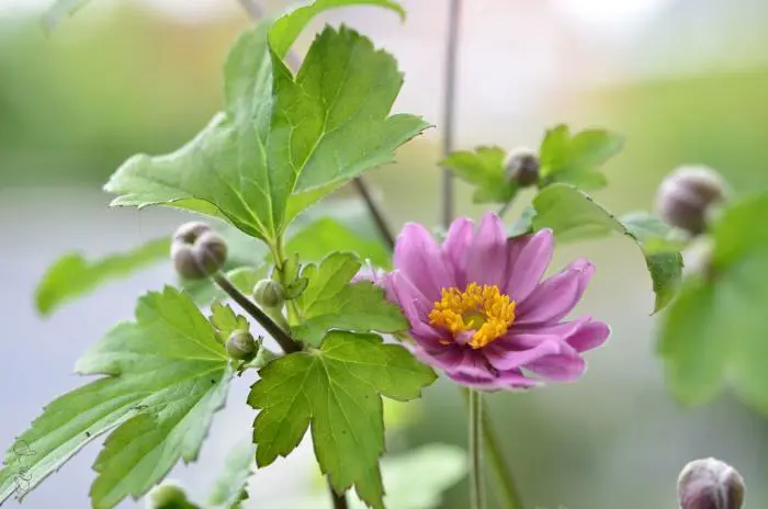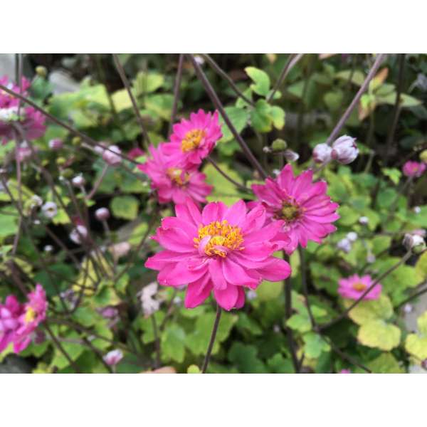 Anemone x hybrida 'Giselle' is een kleinbloemige met dubbele, rozerode bloemen met goudgele meeldraden in het hart.