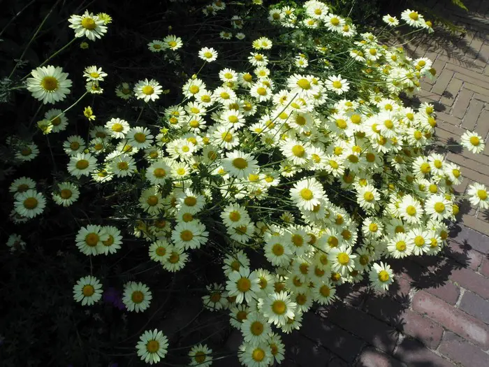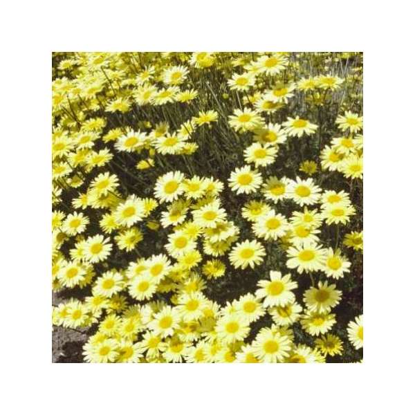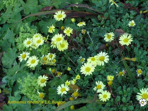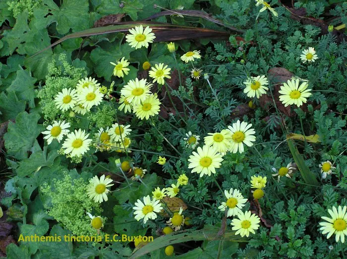 Anthemis x hybr. 'E.C. Buxton' bloeit rijkelijk met zachtgele bloemen met in het centrum een feller geel hart.