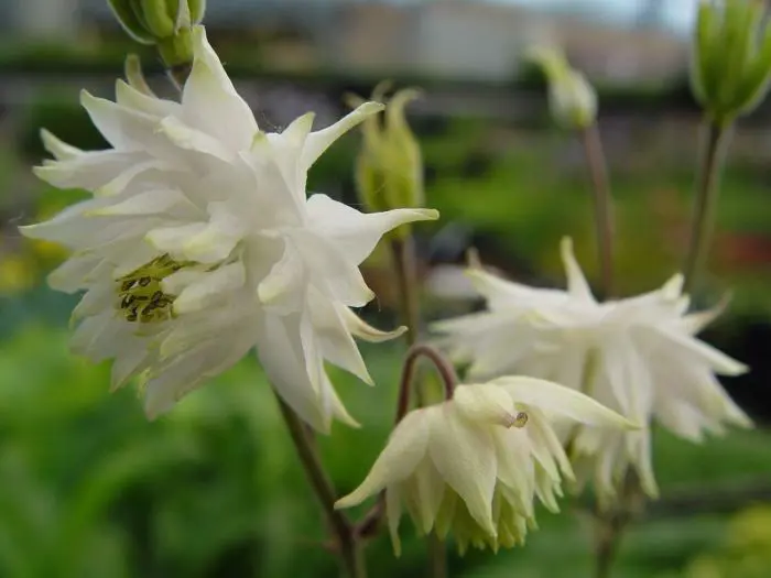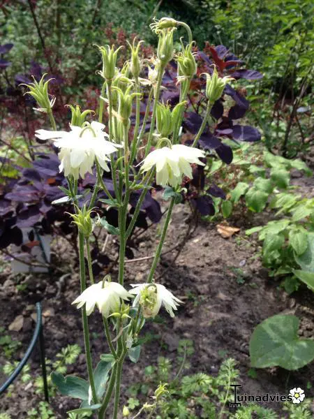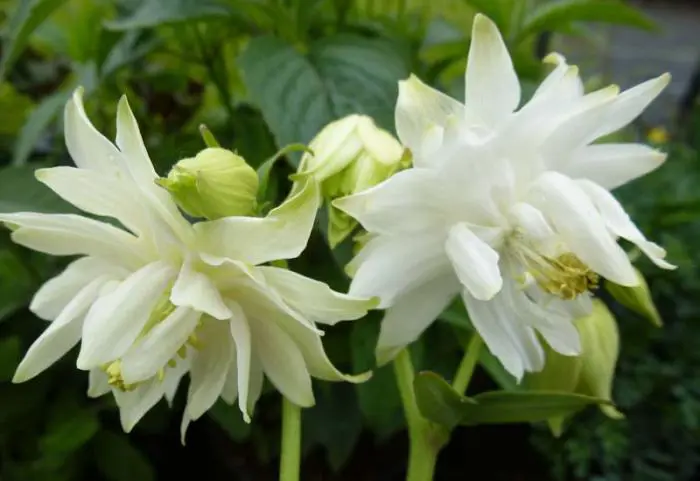Aquilegia vulgaris 'Green Apples' is een zeer sierlijke vaste plant met dubbele witte bloemen met groene tippen.