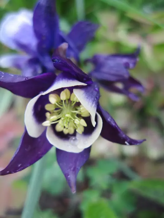 Aquilegia vulgaris 'WINKY Blue-White' zijn zeer sierlijke vaste planten met enkelvoudige witte bloemen met paarsblauwe gespoorde kroonbladen.