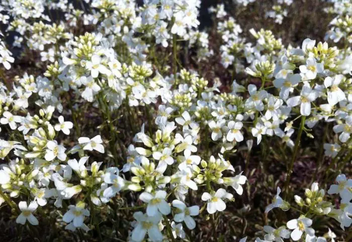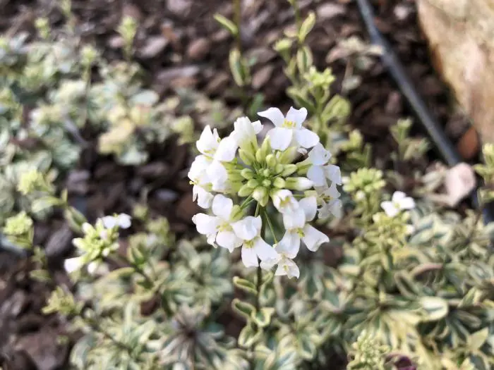 Arabis ferdinandi-coburgi ‘Variegata’ is een bontbladige Arabis, donkergroen met creme en die er heel anders uitziet dan de andere soorten. De blaadjes zijn namelijk wasachtig en rond.