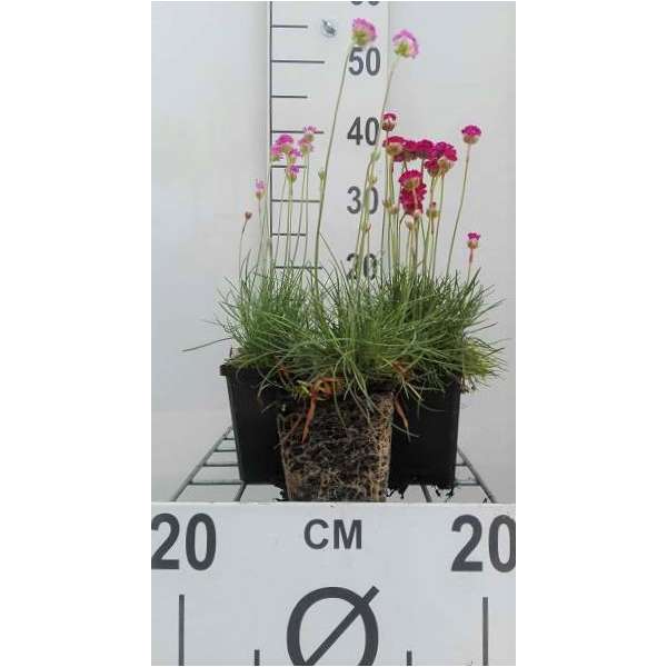 Armeria maritima 'Splendens Perfecta' vormt grasachtige pollen van donkergroene grasachtige bladeren en bloeit rijkelijk met bolvormige donkerroze bloemen op stevige stelen.