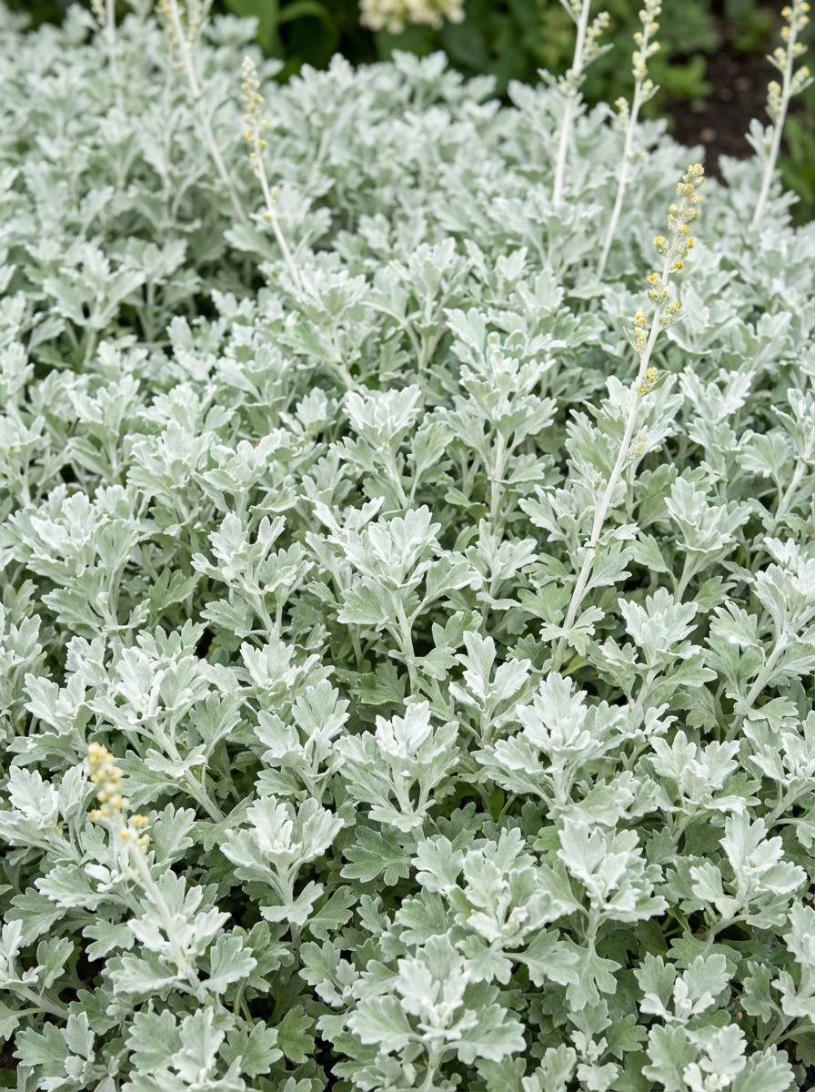 Artemisia stelleriana 'Boughton Silver' is een compacte bodembedekker met zilvergrijze tot bijna witte bladeren, wintergroen in een zachte winter.