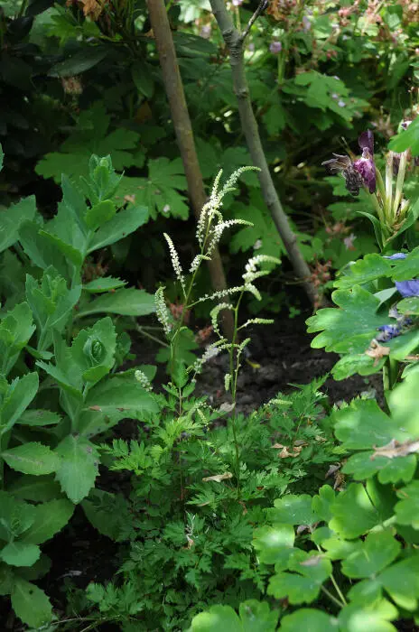 Het varenachtig blad is donkergroen met een bronskleur in het najaar en bloeit met kleinere roomwitte pluimen.