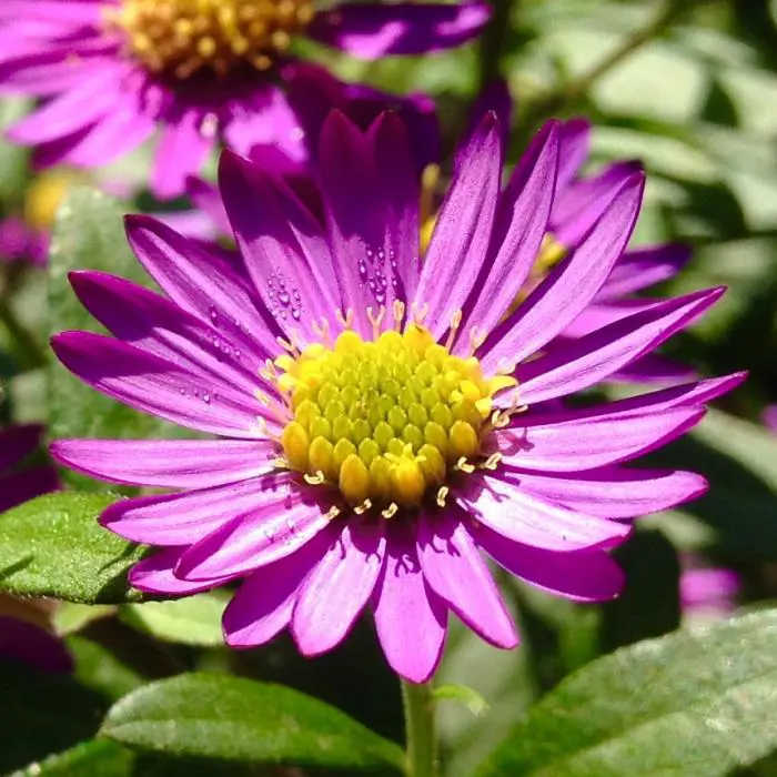 Bloeit met madeliefjesachtige, donker violette bloemen met een geel hartje.