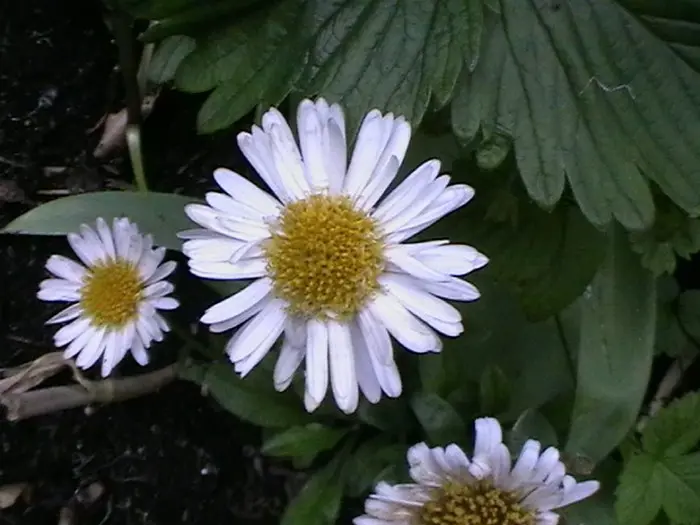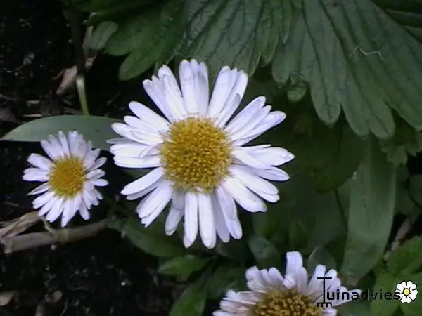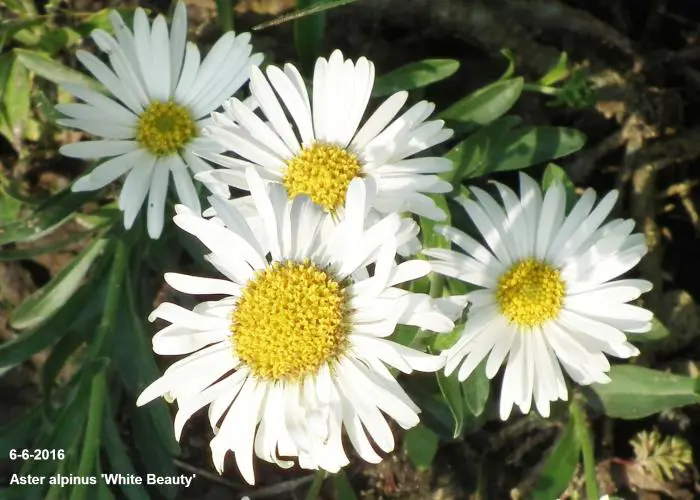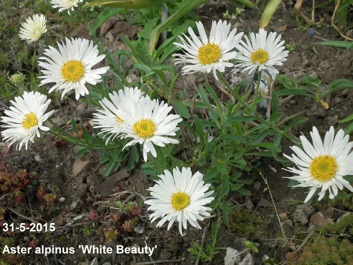 Aster alpinus 'White Beauty' is een kleine compacte, meerjarige maar kortlevende berg- en bodembedekker met lancetvormige groene bladeren.