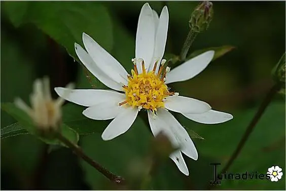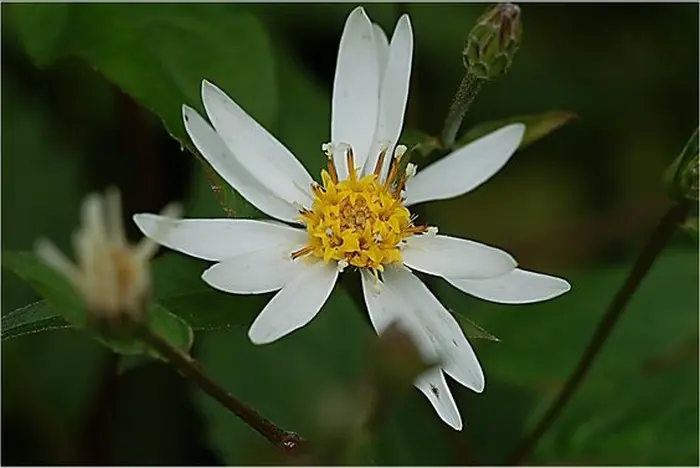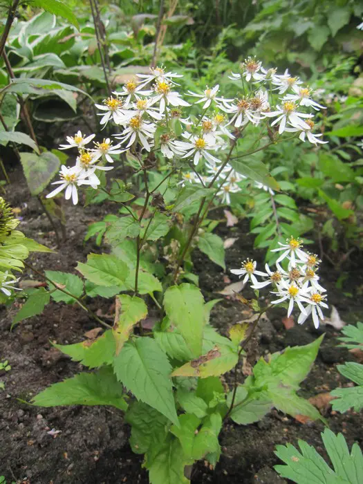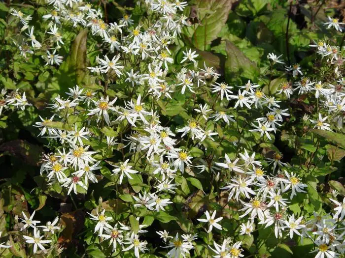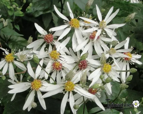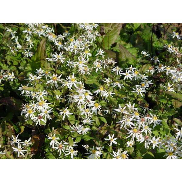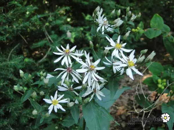 Aster divaricatus is een bossige, rechtopgaande plant afkomstig uit oostelijk N-Amerika met donkerpaarse stengels en hartvormige groene bladeren.