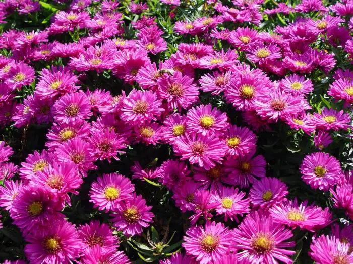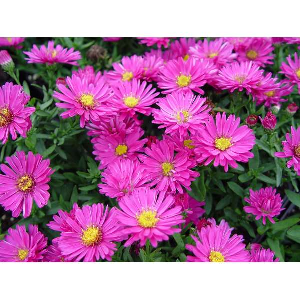 Aster 'Starlight' is een bossige vaste plant, met een compacte, kussenvormige groeiwijze en rozerode margrietachtige bloemen met een goudgeel hart.