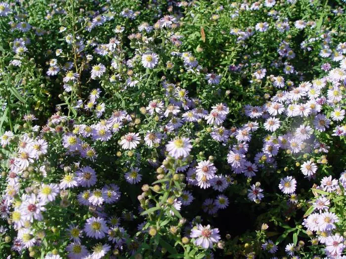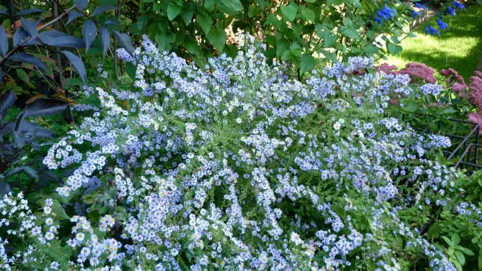 Aster ericoides 'Blue Star' Aster ericoides 'Blue Star' is een vrij compacte variëteit met een overhangende groeiwijze van rijkbloeiende pluimen van kleine licht lavendelblauwe bloemen met een bruin hart.