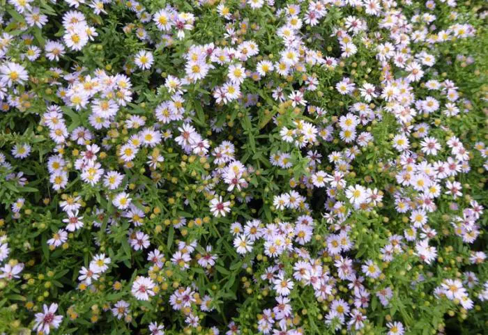 Deze aster blijft zelfs buiten de late zomerbloei aantrekkelijk met zijn kleine, fijne lancetvormige donkergroene bladeren gedragen door slanke stengels.