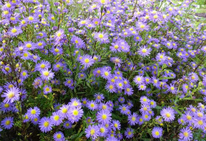 Aster ericoides 'Blue Wonder' is een bossige aster waarvan de dunne, sterk vertakte stengels kleine, smalle donkergroene bladeren dragen.