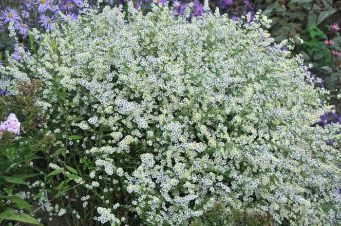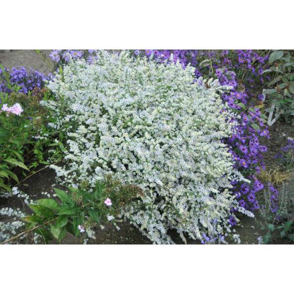 Aster ericoides 'Weisser Zwerg' is een lage, goed bossige aster, waarvan de dunne, sterk vertakte stengels kleine, smalle donkergroene bladeren dragen.