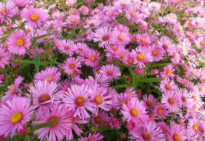 Bloeit rijkelijk in het najaar met helderroze bloemhoofdjes met fijne bloembladen rond een goudgeel hart.