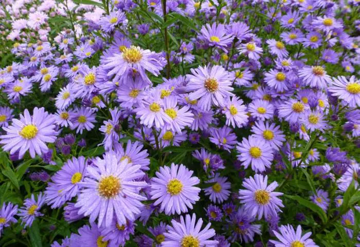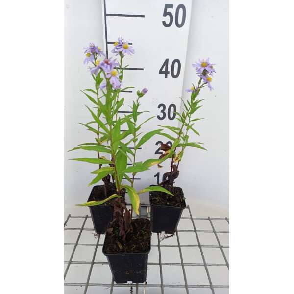 Aster novi-belgii 'Dauerblau' bloeit donker lilablauw.