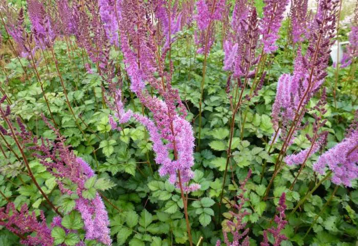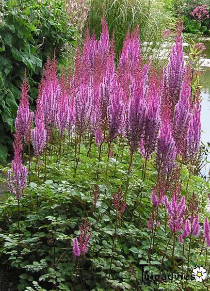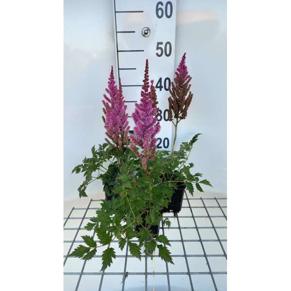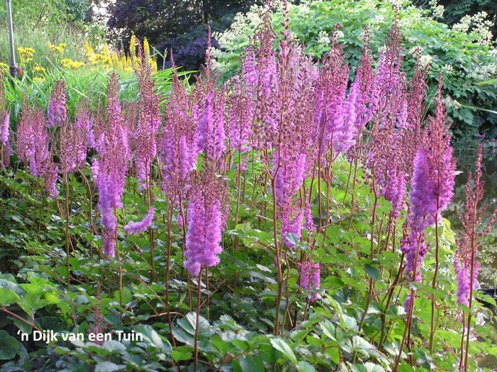 Astilbe chinensis var. taquetii 'Purpurlanze' is een waardevolle plant met mooi gevederd blad en karmijnroze paarse, rechte pluimvormige bloeiwijze.