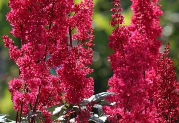 Astilbe 'Montgomery' bloeit donkerrood.