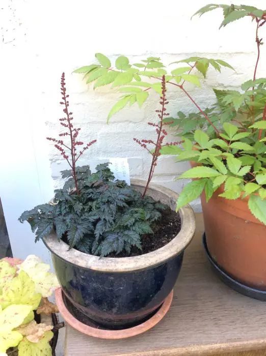 Astilbe 'Moulin Rouge' is een pluimspirea met een compacte gedrongen groeiwijze met bronsgroene gevederde bladeren en frambozenrode pluimen.