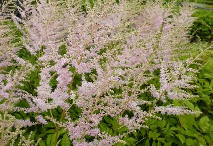 Astilbe thunbergii 'Moerheimii' is een waardevolle plant met mooi gevederd blad en een pluimvormige bloeiwijze. De witte bloemknoppen bloeien met roze bloemen open.