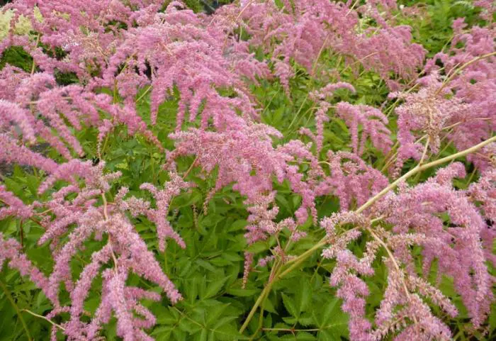 Astilbe thunbergii 'Straussenfeder' bloeiend met zachtroze pluimachtige bloemen.