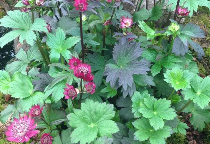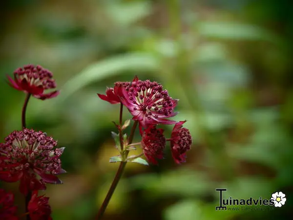 De schermvormige bloemen hebben een heel fijne structuur, stengels, bloemen en schutbladeren zijn diep donkerrood.