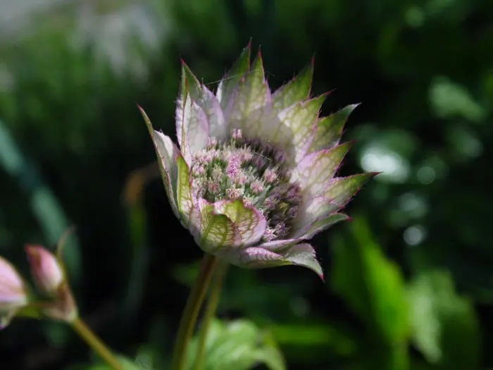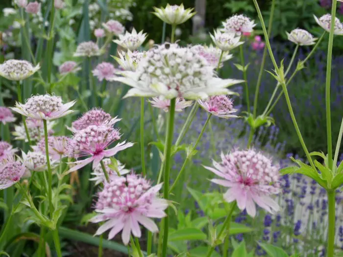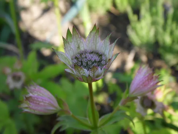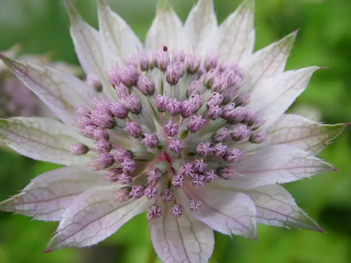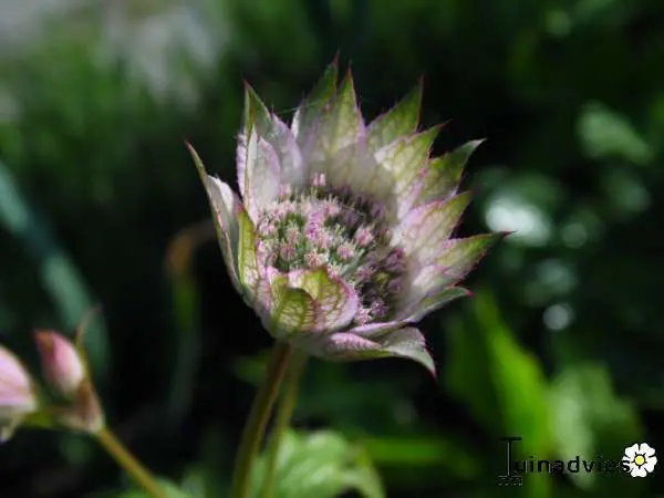 Astrantia 'Neeltje' bloeit met fijn gestructureerde roze bloemen. De schutbladen zijn grijsachtig wit met groene tippen die naarmate de bloeitijd vordert rozer worden.