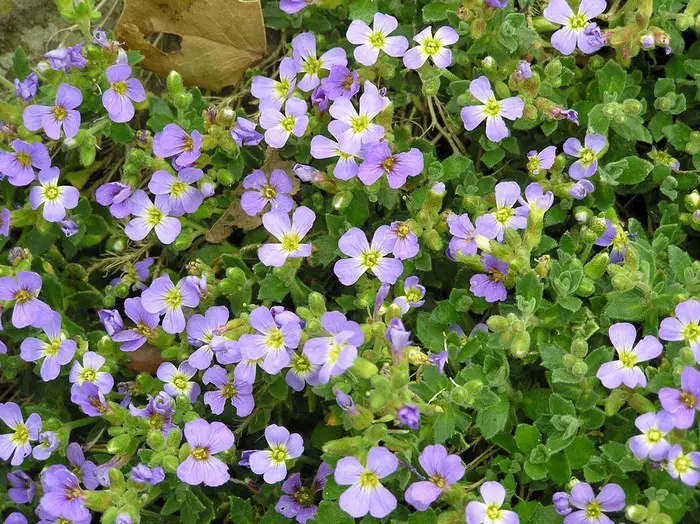 Aubrieta 'Downers' is een zodevormende alpiene plant, vormt grote tapijten van violetblauwe bloempjes met een klein geel hartje.