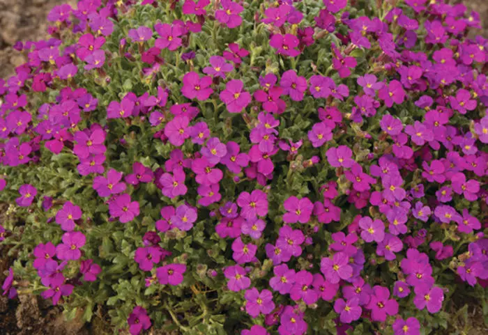Aubrieta 'REGADO Red' is een zodevormende alpiene plant, vormt een tapijt van intens magentarode bloempjes met een klein geel hartje.