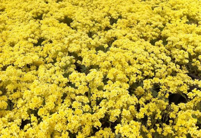 De zwavelgele kruisbloemen staan in dichte pluimen bijeen.