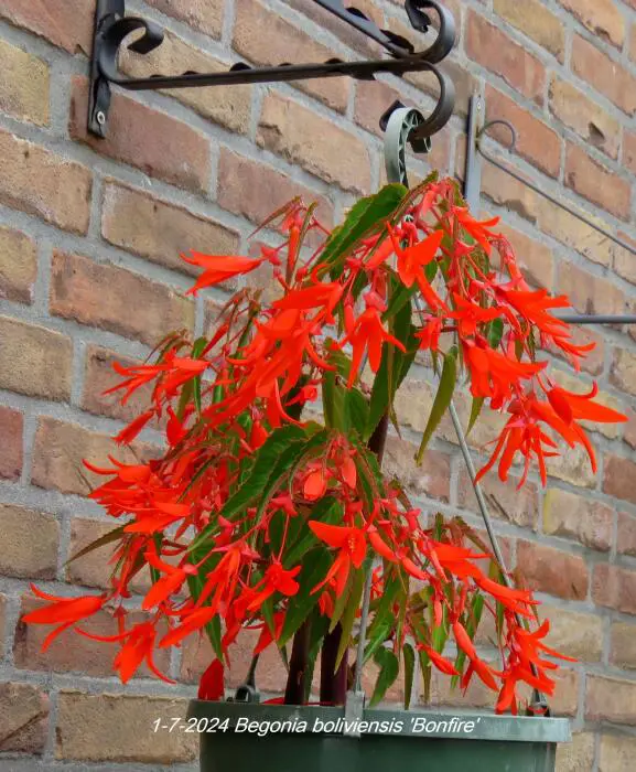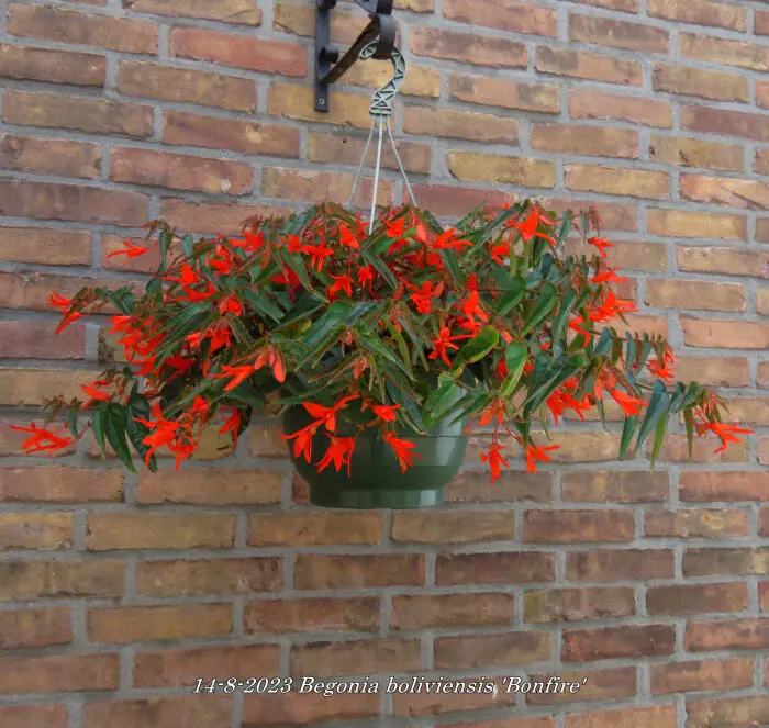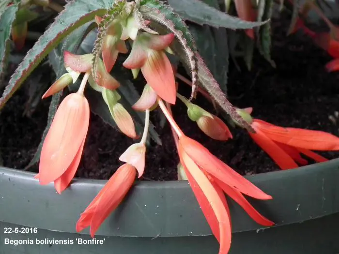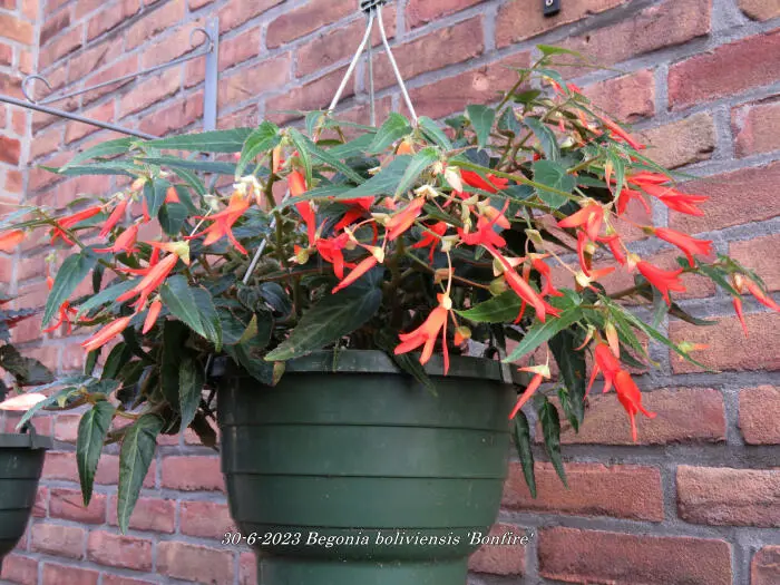 Begonia boliviensis 'Bonfire' is een rechtopstaande, bossige vaste plant, vaak als eenjarige gekweekt, met driehoekig, donkergroen blad met roodgekleurde, gekartelde randen.