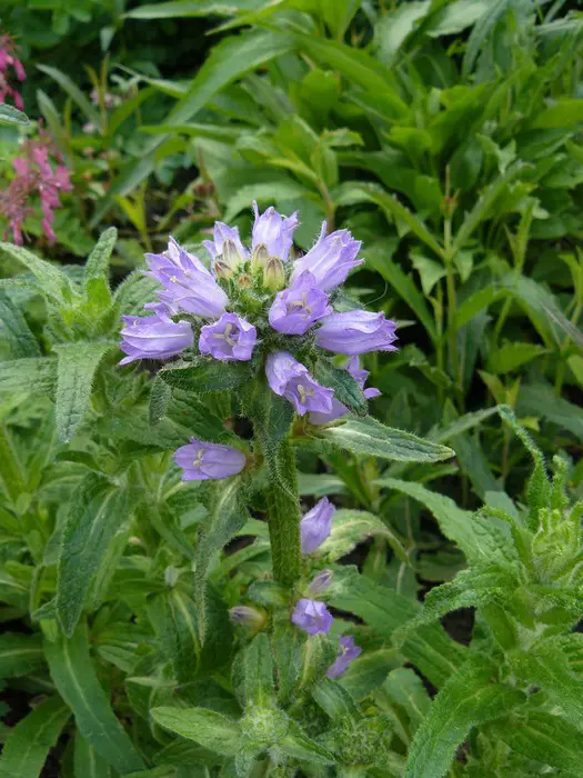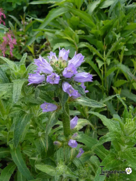 Campanula cervicaria bloeit met violetblauwe klokjes in dichte trossen en lijkt wel een beetje op Campanula glomerata maar is toch wel verschillend. De bloemkleur is iets lichter.