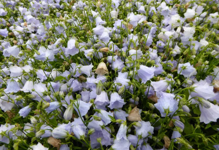 Campanula cochleariifolia 'Elizabeth Oliver' bloeit rijkelijk met gevulde, poederblauwe klokjes.