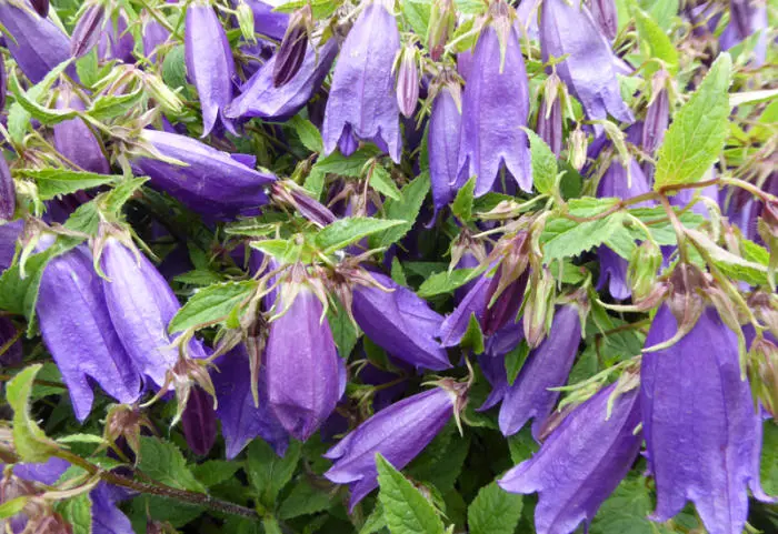 Campanula RINGSABELL is een serie compacte klokjesbloemen met geschubde randen en hangen aan fijne steeltjes.