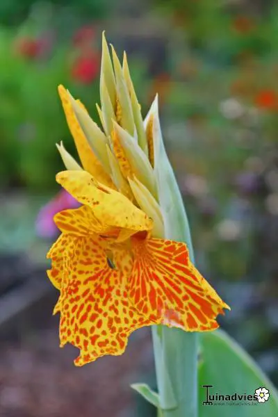 Canna 'Picasso' bloeit met prachtige erg opvallende oranjegele bloemen gevlamd met oranjerood.