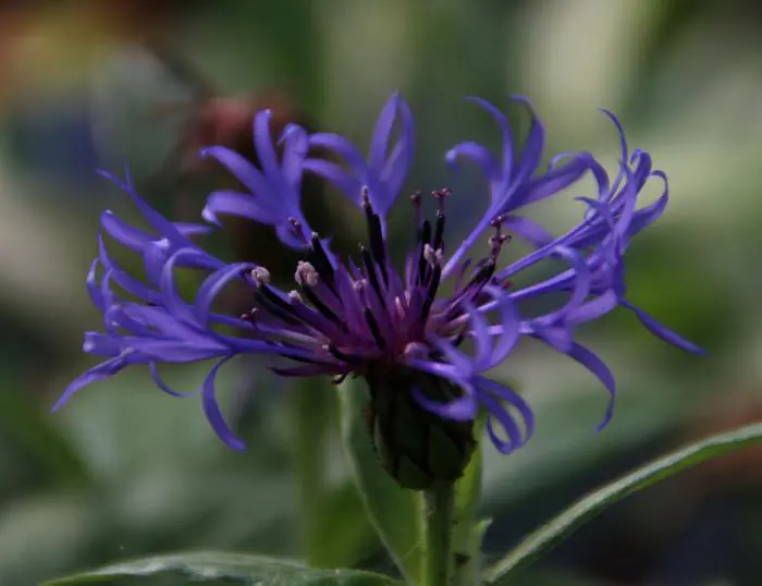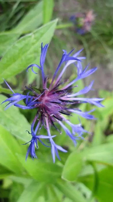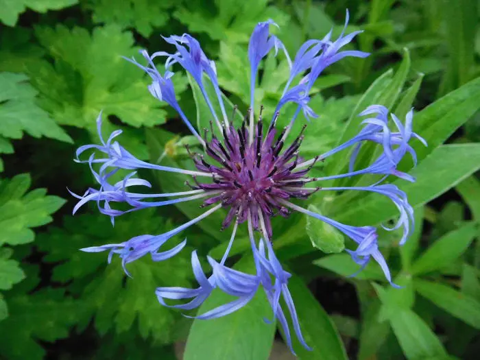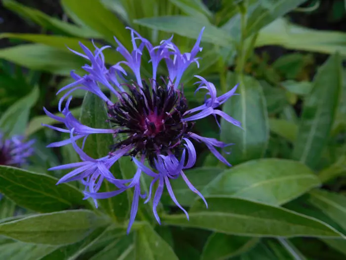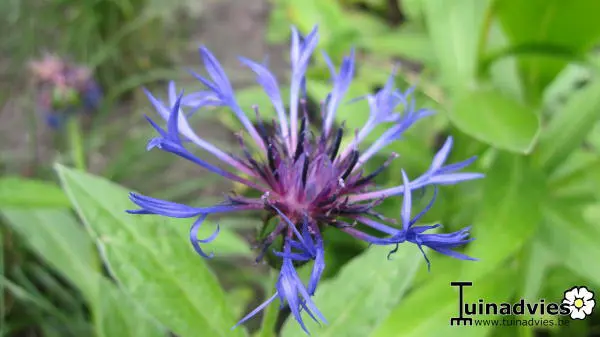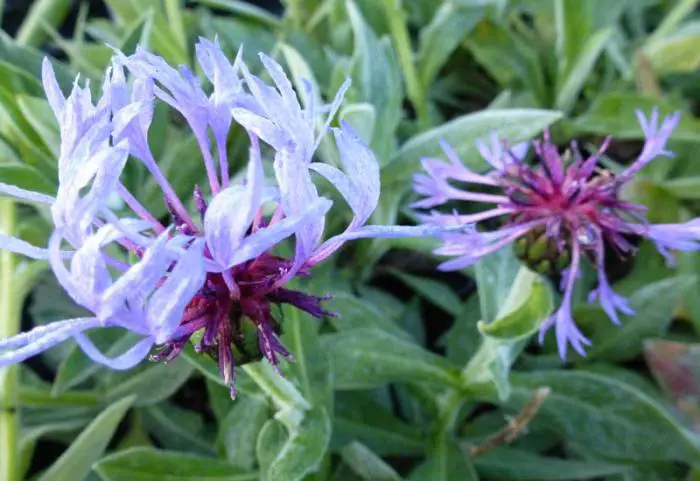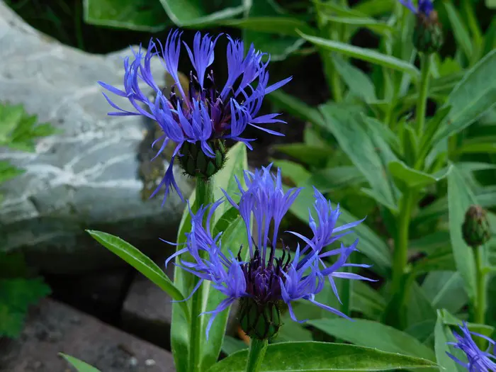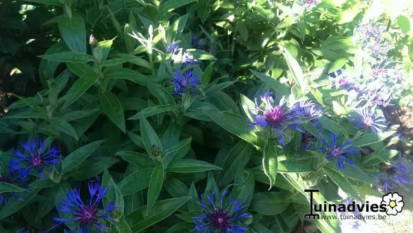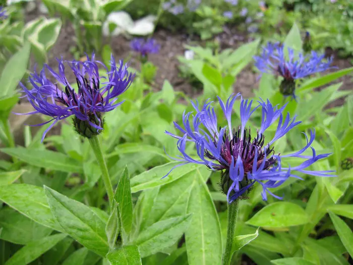 Centaurea montana 'Coerulea' bloeit met paarsblauwe, losse bloemhoofdjes op rechte stelen.