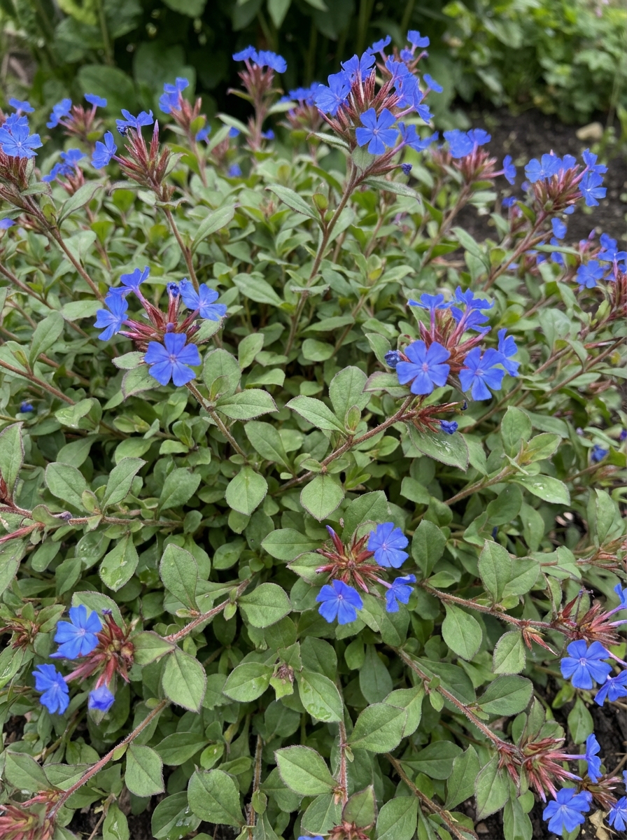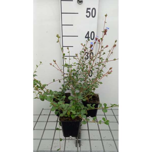 In de herfst verkleuren de blaadjes en de stengel tot bronsrood, prachtig met de hemelsblauwe bloempjes.
