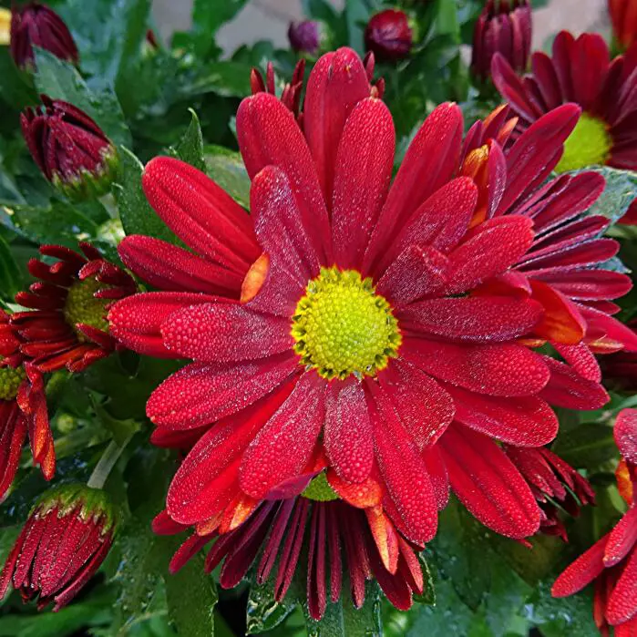 Chrysanthemum indicum 'Elliot' is een bossige, kruidachtige plant met een overvloed aan donkerrode enkelvoudige bloemen met in het centrum een geel hart.