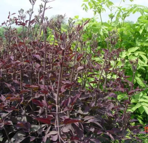 Heeft donkerpaarse bladeren.