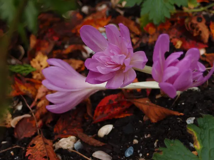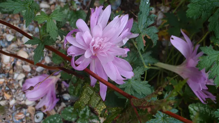 Colchicum ‘Giant’ bloeit met erg grote, trechtervormige lavendelroze bloemen (8cm) met een witte keel. Het is ook één van de grootste cultivars H.20cm.
